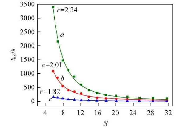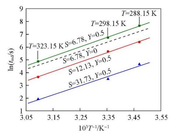 分別在288.15,298.15和323.15 K時研究了NaCl的添加對Li2CO3成核誘導(dǎo)期的影響,每組實驗均在Cl?的超額含量(Y=0.5)的條件下進(jìn)行,結(jié)果見圖4.可知,在同一溫度下,Li2CO3的成核誘導(dǎo)期仍然隨過飽和度的增大而縮短;在同一過飽和度下,Li2CO3的成核誘導(dǎo)期隨溫度的升高而縮短,而且在添加NaCl(Y=0.5)后,溫度對Li2CO3成核誘導(dǎo)期的影響比未添加(Y=0)時更為顯著.如,在過飽和度S=5.76,溫度從288.15 K升高到323.15 K時,添加NaCl后Li2CO3的成核誘導(dǎo)期縮短了73.01%,而未添加NaCl時Li2CO3的成核誘導(dǎo)期縮短了67.89%.
