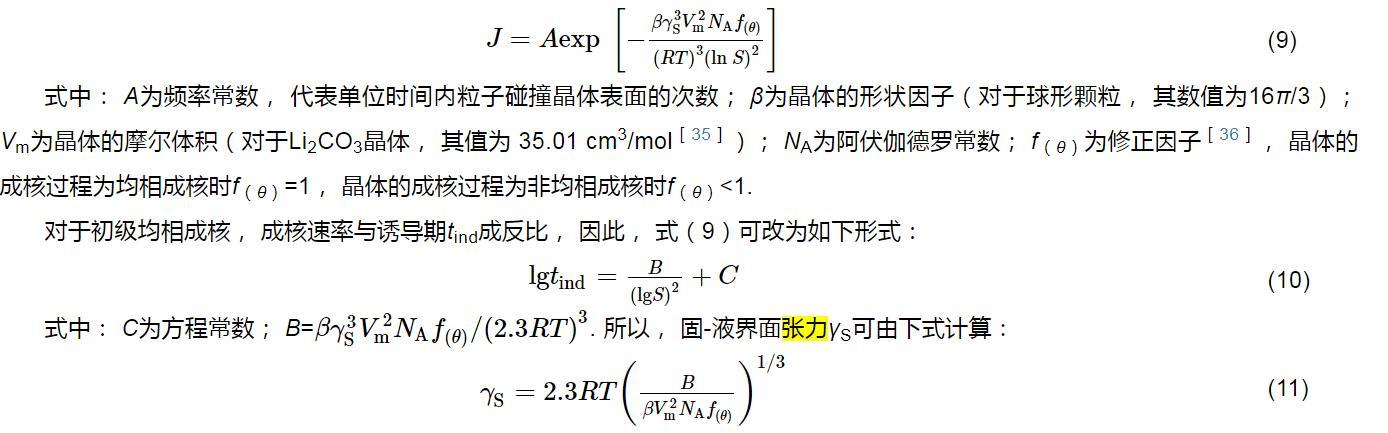 為了更深入地研究Li2CO3的成核過程,將以Li2CO3晶核與周圍溶液間的固-液界面張力為切入點來探討其成核機(jī)制.