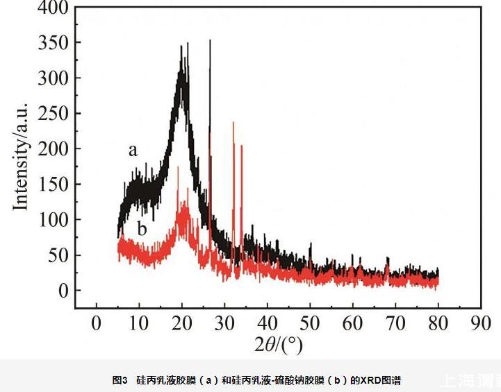 圖3硅丙乳液膠膜(a)和硅丙乳液-硫酸鈉膠膜(b)的XRD圖譜