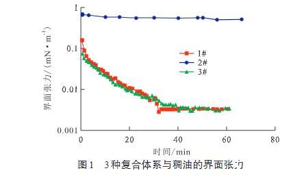 此外,1#超低界面張力復合體系和3#雙效復合體系形成稠油乳狀液的穩定性較2#乳化復合體系差,這也說明乳狀液的穩定性與超低界面張力無正相關性,可能更多地取決于油水界面膜的強度。超低界面張力甚至不利于乳狀液的穩定,因為:①油水界面能低,界面極易擴展,油水界面上局部表面活性劑濃度瞬時降低,水化膜厚度變薄,不利于乳狀液的穩定。②油水界面的擴展,增大了油滴碰撞的幾率。③能形成超低界面張力的表面活性劑具有更好的親水親油平衡,更傾向于在水平的油水界面鋪展,而不是像乳狀液一樣的彎曲界面。
