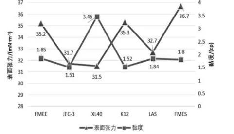 查閱大量文獻發(fā)現(xiàn),大多數(shù)表面活性劑溶液在質(zhì)量分?jǐn)?shù)達到5%時,其表面張力變化程度保持在穩(wěn)定的數(shù)值。因此本文對表面活性劑溶液按質(zhì)量分?jǐn)?shù)為5%進行實驗研究,實驗結(jié)果如圖2所示。