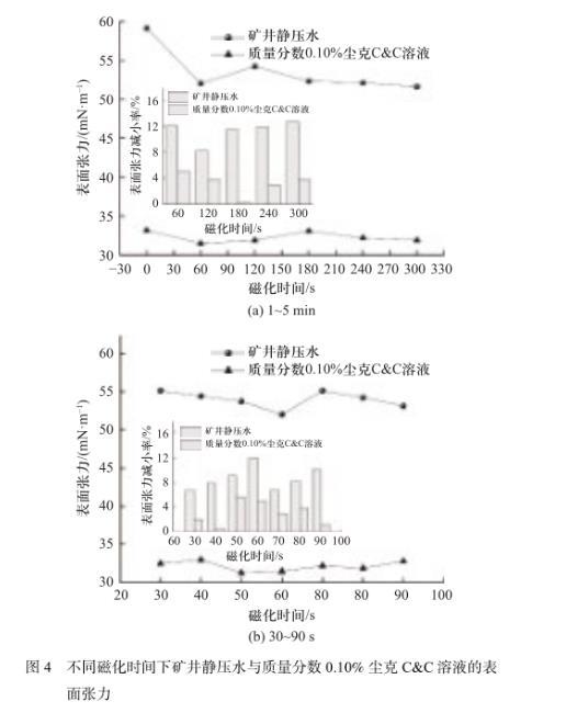 圖4不同磁化時間下礦井靜壓水與質量分數0.10%塵克C&C溶液的表面張力