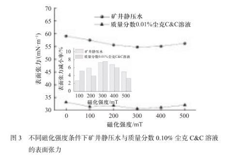 圖3不同磁化強度條件下礦井靜壓水與質量分數0.10%塵克C&C溶液的表面張力