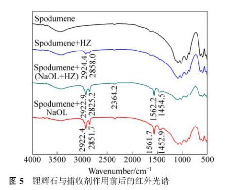 鋰輝石與不同藥劑作用前后的紅外光譜如圖5所示,鋰輝石與NaOL作用后在2922.4和2851.7 cm?1波長處都有峰存在,在此波長范圍內(nèi)為甲基(—CH3)、亞甲基(—CH2—)的伸縮振動共振峰,表明NaOL在鋰輝石表面有吸附作用。在1561.7和1452.9 cm?1波長處有新峰產(chǎn)生,其中1452.9 cm?1波長處為亞甲基(—CH2—)的變形振動共振峰,1561.7 cm?1處為油酸鋁的吸收峰,表明NaOL在鋰輝石表面生成了新的物質(zhì),新峰產(chǎn)生表明這種吸附作用是化學(xué)吸附。鋰輝石與HZ作用后在2924.4和2858.0 cm?1波長處都有峰存在,在此波長范圍內(nèi)為甲基(—CH3)、亞甲基(—CH2—)伸縮振動共振峰,表明HZ在鋰輝石表面有吸附作用。而鋰輝石與HZ藥劑作用后,光譜圖譜中沒有新峰產(chǎn)生,表明這種吸附不是化學(xué)吸附,HZ是一種非離子型捕收劑,它在鋰輝石表面的吸附不是靜電吸附,結(jié)合Zeta電位結(jié)果分析推測這種吸附可能是氫鍵作用。鋰輝石與(NaOL):(HZ)=5:1組合捕收劑作用有新的峰產(chǎn)生,但仍是和鋰輝石與NaOL作用后的吸收峰類似,表明捕收劑經(jīng)過組合后,HZ并沒有和NaOL生成新的物質(zhì)從而改變吸收峰的位置。