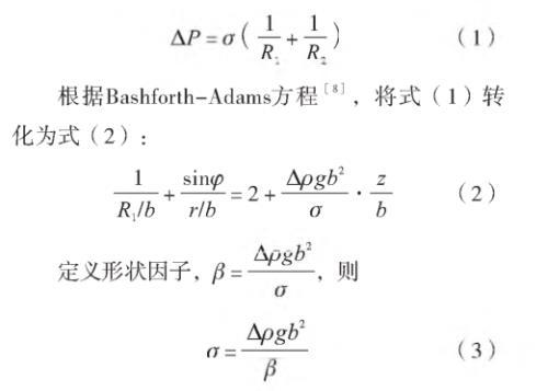 座滴法是基于熔體(液體)在水平托板表面形成穩(wěn)定橢球液滴的形狀參數(shù)測量表面張力的方法[6]。基于座滴法測量玻璃熔體表面張力,玻璃熔體在水平托板上受重力和表面張力共同作用形成旋轉(zhuǎn)軸對稱橢球[7](圖1),橢球表面任一點的壓力差與表面張力之間的數(shù)學(xué)關(guān)系見式(1):