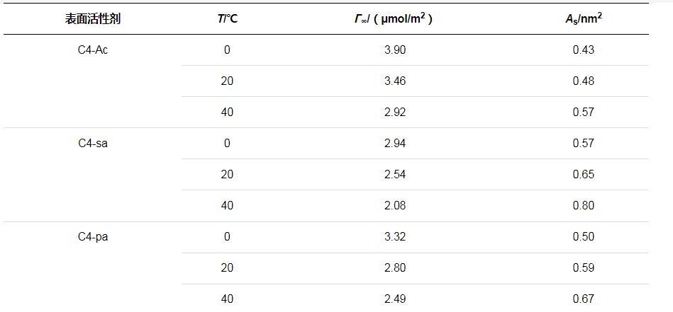 通常較高的Γ∞和較低的AS值表明表面活性劑分子密集地排列在空氣與水的界面上,由上述公式計算得到三種表面活性劑的Γ∞和較低的AS值如表2所示。對比參數可知,同種表面活性劑的Γ∞均隨溫度的升高而減小,AS有所增大,吸附表面的分子排布較為松散。這是由于溫度較高的情況下表面活性劑分子熱運動加劇,更易從吸附界面上脫離,并且因無規則運動導致吸附分子所占面積增大了。溫度升高導致溶解度的增加,因而表面的Γ∞會有所減小。由于Γ∞還受到表面張力隨濃度變化曲線斜率的影響,因此所得趨勢是綜合影響的結果。此外,由表中還可以看出,C4-sa分子的Γ∞最小,AS最大,在溶液表面的排列更加松散。這可能是由于親水端磺酸基團之間強靜電排斥力,并且空間位阻較大。
