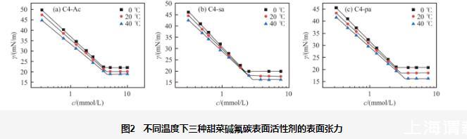 總體而言,溫度對甜菜堿氟碳表面活性劑的cmc影響較小。此外,在0~40℃的溫度范圍內,對比三種表面活性劑的表面活性參數可知,cmc值均小于4.45 mmol/L,γcmc均小于22.19 mN/m。親水端官能團的不同對表面活性劑的性能具有一定的影響,當溶液濃度足夠大時,C4-Ac的表面張力相對較高,C4-sa和C4-pa具有較低的表面張力,后者略高于前者,并且C4-sa和C4-pa的cmc值低于C4-Ac。因為從分子結構上來看,C4-Ac比C4-sa和C4-pa少一個有效碳,因此前者的疏水性要略弱于后二者,可以解釋表面張力和cmc的相對大小。