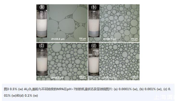 體系成份的濃度對乳液的外觀及粒徑有很大影響。圖3為固定0.5%(w)Al2O3顆粒濃度不變,研究在pH=7時不同MPA濃度對Pickering乳液的影響。隨著MPA濃度的不斷增加【0.0001%——0.1%(w)】,乳液下層析出的水相逐漸變澄清,說明MPA濃度增加,更多的Al2O3顆粒與MPA分子發(fā)生靜電相互作用,修飾后的Al2O3顆粒更容易從水相層中轉(zhuǎn)移到乳化層中,吸附在油水界面處,并且乳化層的高度也隨著MPA濃度的增加而升高,也說明更多的活性Al2O3顆粒參與乳化。乳液液滴粒徑隨濃度增加逐漸減小,從235.6μm降低到32.5μm,這是因?yàn)橛退缑嫣幍幕钚訟l2O3顆粒的量逐漸增多,可以穩(wěn)定更多的Pickering乳液液滴。