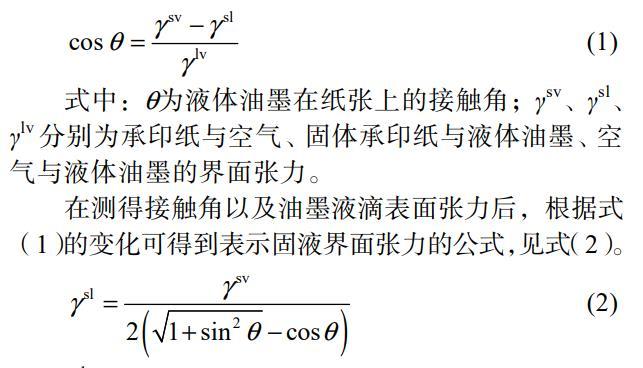 式中:θ為液體油墨在紙張上的接觸角;γsv、γsl、γlv分別為承印紙與空氣、固體承印紙與液體油墨、空氣與液體油墨的界面張力。在測(cè)得接觸角以及油墨液滴表面張力后,根據(jù)式(1)的變化可得到表示固液界面張力的公式,見(jiàn)式(2)。
