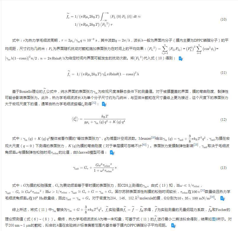 公式中,純水界面的表面張力為宏觀尺度準靜態條件下的測量值。對于被膜覆蓋的界面,膜的彎曲剛度、黏彈性可能會影響表面張力。此外,熱力學毛細波波長為單個分子尺寸約為幾納米,與亞微米顆粒在尺寸量級上更為接近,這個尺度下的表面張力大于宏觀尺度下的值,通常由熱力學毛細波振幅測得: