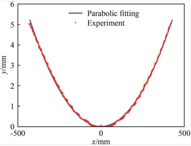 為驗證曲線方程(10),在砝碼質(zhì)量m=0.2 kg、皂液流量Q=35 mL/min時,實測了穩(wěn)態(tài)流動皂膜狀態(tài)下尼龍繩的位置坐標,如圖2中的離散點所示。尼龍繩位置通過照相得到,為獲得較大范圍內(nèi)的圖像,采用的放大倍數(shù)為1個像素對應(yīng)0.35 mm的物理尺寸。對尼龍繩圖像在水平方向的光強分布進行高斯函數(shù)擬合以獲得亞像素的定位精度。圖2中的光滑曲線是采用式(10)進行擬合的結(jié)果,與實測曲線吻合良好,驗證了分析的正確性。利用已知的砝碼質(zhì)量,可以進一步得到表面張力系數(shù)γ=27.5 mN/m。值得注意的是:當砝碼質(zhì)量很小時,表面張力引起的流道收縮很大(在中點O處達到最大值12%),為避免由此帶來的流速和厚度場改變,在流動皂膜實驗中一般使用m=2 kg的砝碼。