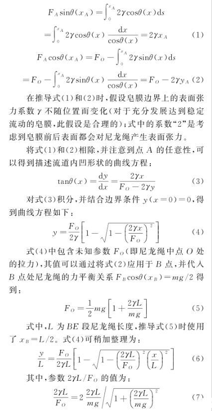 在推導(dǎo)式(1)和(2)時,假設(shè)皂膜邊界上的表面張力系數(shù)γ不隨位置而變化(對于充分發(fā)展達到穩(wěn)定流動的皂膜,此假設(shè)是合理的);式中的系數(shù)“2”是考慮到皂膜前后表面都會對尼龍繩產(chǎn)生表面張力。
