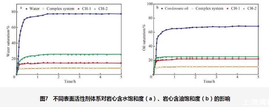經(jīng)3種體系處理后,巖心的含水飽和度均降低,經(jīng)CH-1和CH-2處理過的巖心含水飽和度分別降至14.64%和25.79%,而經(jīng)陽-非離子復(fù)合表面活性劑體系處理后,巖心含水飽和度由77.4%降至8.10%。由圖7b可看出,未被表面活性劑處理的巖心在自發(fā)滲吸時間為0.5 h時,巖心自發(fā)滲吸達(dá)到飽和,此時巖心含油飽和度增至68.90%。巖心經(jīng)3種體系處理后,巖心的含油飽和度均降低,經(jīng)CH-1和CH-2處理過的巖心含油飽和度分別降至22.29%和25.53%,而經(jīng)陽-非離子復(fù)合表面活性劑體系處理后,巖心含油飽和度降至11.25%。