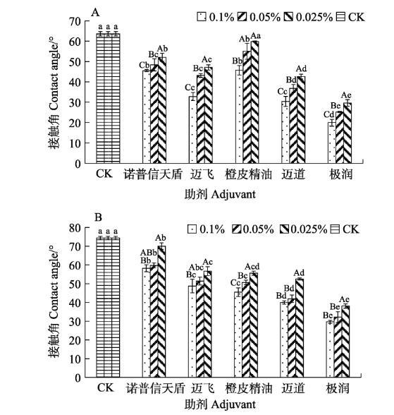 2.3不同助劑對乙基多殺菌素藥液在杧果葉片接觸角的影響