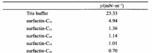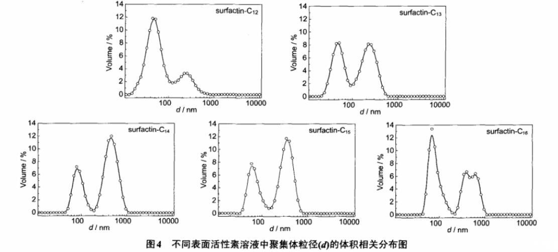 由圖4可知,從相對(duì)體積比例來看,鏈長較短的surfactin-C12大部分是形成直徑為40 nm左右的膠束,少部分形成直徑大于200 nm的膠束聚集體。隨著表面活性素烷基鏈的增長,形成的聚集體的直徑明顯增加,也有更多的大粒徑聚集體形成。
