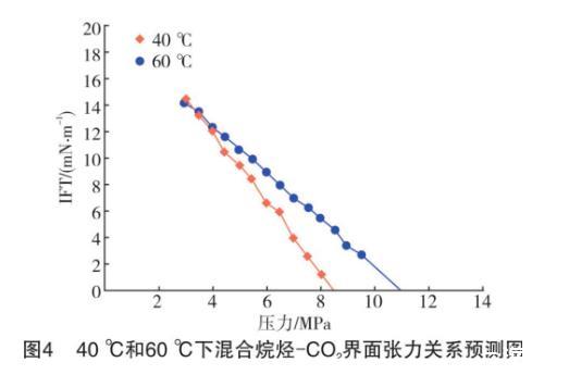 (1)烷烴組分。對比文獻的結果發(fā)現(xiàn),40℃和60℃下所得到的MMP值均小于文獻值,其結果對比見表3。