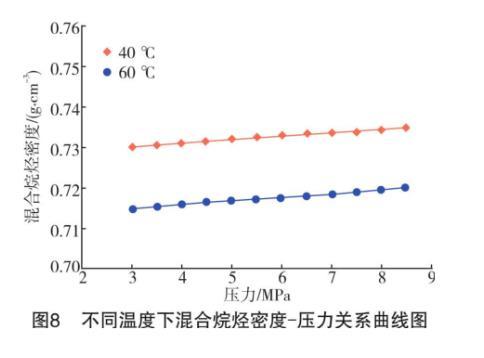 從混合烷烴密度-壓力曲線(見圖8)來看,整個測試壓力區(qū)間內(nèi)溫度對混合烷烴的密度影響不大,因此液體密度也不會造成界面張力的較大變化。從CO2密度-壓力曲線(見圖7)來看,溫度在中高壓下對CO2密度的影響較大。尤其是在3.5 MPa之后,60℃下的氣體密度隨著壓力升高速率明顯高于40℃時的速率。在同一壓力下,氣體密度隨著溫度升高顯著降低。密度較低的CO2氣體分子分布越稀疏,與烷烴液面直接接觸的氣體分子越少,故降低了二者發(fā)生萃取和混溶的概率,間接地導致液體的界面張力值增加。