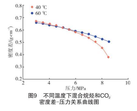 一方面,高溫可以對液體分子之間的相互作用力產(chǎn)生削弱作用,加劇分子間的不規(guī)則運動。此時,CO2氣體分子更容易與液相發(fā)生混溶,而定量表現(xiàn)出來的就是界面張力的降低。另一方面,根據(jù)混合烷烴和CO2的密度和二者的密度差數(shù)據(jù),繪制出不同溫度下CO2氣體密度和氣液密度差隨壓力升高的變化曲線,如圖7~圖9所示。從密度差-壓力曲線(見圖9)來看,隨著溫度升高,在可比較的實驗壓力范圍內(nèi),中低壓(3~6 MPa)下不同溫度的氣液密度差非常接近,可以忽略不計。但高于6 MPa后,高溫下氣液密度差逐漸加大。較高的密度差導致了氣液難以形成混相,同一壓力下界面張力更大。