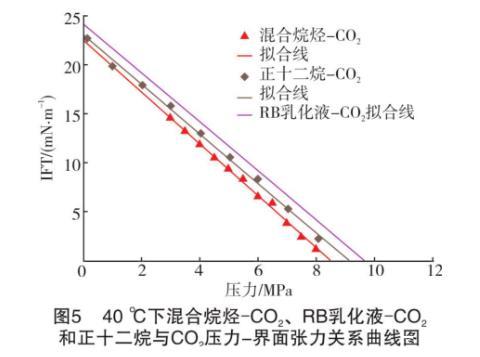 假設RB乳化液-原油不考慮斜率變化部分,始終以低壓階段(小于6 MPa)的斜率表示界面張力的變化。將表中同一溫度下不同系統(tǒng)的關系式展現(xiàn)在曲線圖上(見圖5和圖6)。從圖5和圖6可知,不論在哪個溫度下,混合烷烴和RB乳化液的壓力-界面張力曲線都接近平行,即兩種油的界面張力隨著壓力的升高幾乎以同樣的速度降低。計算得知,40℃和60℃下實驗混合烷烴和RB原油的壓力-界面張力關系式中的斜率誤差為6.0%和8.6%。縱觀兩種油的組成發(fā)現(xiàn),本實驗所使用的混合烷烴中正十二烷的摩爾分數(shù)達71.07%,而RB原油中的C12+的摩爾分數(shù)達到57.66%。也就是說,混合烷烴和原油的組分中占主導作用的是高碳數(shù)的正構烷烴。據(jù)姬澤敏等的大量實驗研究,界面張力在不同的正構烷烴-CO2體系中具有極好的規(guī)律性,在相同的溫度壓力條件下,正構烷烴的碳數(shù)和界面張力成正比關系。從文獻中RB原油組成分析得知,C12+的分子量高達366 g/mol,而本實驗中的混合烷烴的分子量僅為156.74 g/mol。由此得知,實驗誤差的主要來源是高碳正構烷烴的組成不同。
