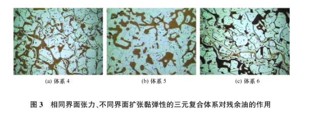 圖3相同界面張力、不同界面擴張黏彈性的三元復合體系對殘余油的作用
