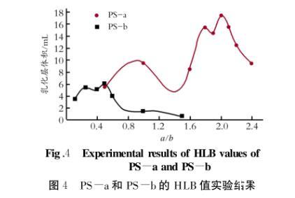 根據實驗結果,按照乳化層體積最大時的待測/標準表面活性劑配比,計算出PS-a和PS-b的HLB值分別為13.5和12.0。PS-b的HLB值小于PS-a的HLB值,表明PS-b的親水性比PS-a的親水性小。根據Davis法計算HLB值的原理,可知: