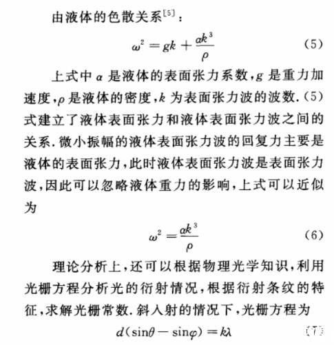 d為光柵常數,在此情況下,光柵常數即為液體表面張力波的波長,θ為斜入射角,φ為衍射角,k為衍射級次,λ為光波的波長。通過測量觀測距離、衍射條紋的間距等量可求出衍射角和光柵常數。再根據液體的色散關系(5)式,求得液體表面張力。具體的測量和求解過程,這里不再贅述。
