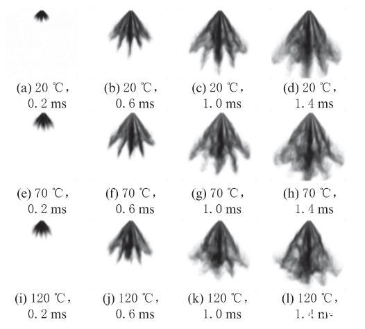 圖5不同環境溫度和噴霧開始后時刻下乙醇的噴霧形態