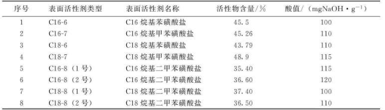 石油磺酸鹽具有降低油水界面張力、來源廣和價格低等優勢,因而在三次采油中占有極其重要的地位。但同時由于它的未磺化油含量較高,造成低滲透油層的注入困難。烷基苯磺酸鹽是一種碳鏈長度固定、結構相對單一的表面活性劑,其未磺化油含量相對較低,遠遠小于石油磺酸鹽。筆者通過配制弱堿三元復合體系評價其界面活性,試驗研究了烷基苯磺酸鹽結構與界面活性的關系,旨在為弱堿三元復合驅優選表面活性劑提供重要依據。