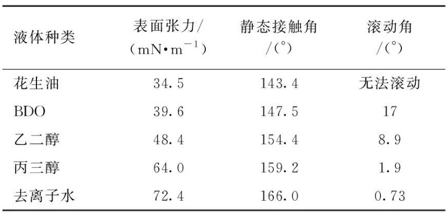 表2不同表面張力液體在超疏涂層上的接觸角和滾動角