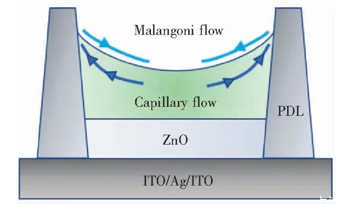 量子點(diǎn)的成膜形貌與墨水配方密切相關(guān)。與平面上成膜容易產(chǎn)生咖啡環(huán)類似,在像素結(jié)構(gòu)中量子點(diǎn)容易形成邊緣堆積的薄膜形貌。為了使量子點(diǎn)從邊緣遷移到像素坑中心,需要增大液滴內(nèi)部自外而內(nèi)的馬蘭戈尼流。