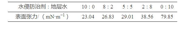 參照石油天然氣行業標準SY/T 5370—2018《表面及界面張力測定方法》中“圓環法”的要求,測定水侵防治劑與地層水按不同比例(體積比)混合后的表面張力值,結果見表1。可以看出,隨著水侵防治劑溶液比例的逐漸增大,溶液的表面張力值逐漸減小,當水侵防治劑與地層水按5∶5混合時,表面張力即可以降低至30 mN/m以下,說明水侵防治劑具有良好的降低表面張力的能力,從而有助于氣井解堵措施后的返排,提高施工效率。