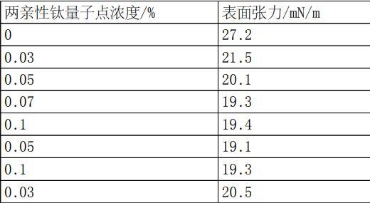 按照100%計(jì),由以下重量含量的原料組成:兩親性鈦量子點(diǎn)0.03-0.1%,兩性表面活性劑0.2-0.4%,陰-非離子表面活性劑0.05-0.2%,助溶劑0.1-0.2%,抑泡劑0.1-0.3%,余量的水;其中,所述兩親性鈦量子點(diǎn)是通過(guò)以下方法制備得到的:先通過(guò)水熱法將鈦酸酯類(lèi)偶聯(lián)劑水解并縮合形成鈦基量子點(diǎn),再通過(guò)硅烷偶聯(lián)劑進(jìn)行一次改性,隨后利用功能單體進(jìn)行二次表面原位聚合改性,所述功能單體為疏水單體、丙烯酸和耐溫耐鹽單體。