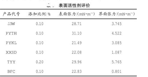 由表2可知,3種表面活性劑均具有較好的降低表面張力效果,在較低濃度時就達到了較低表面張力,且隨著濃度的增加表面張力趨于平穩;3種表面活性劑按降低表面張力性能由高到低排序依次為PYKL、XXSD和BFC。