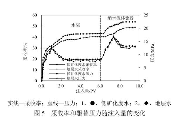 在驅油機理實驗探究的基礎上,優(yōu)選納米ZIF-8顆粒質量分數為0.03%的納米流體進行巖心驅替實驗。采收率及驅替壓力隨注入體積的變化如圖5所示。使用模擬地層水、低礦化度水首次驅替至無油產出時的采收率分別為40.24%、43.06%。轉注含納米ZIF-8顆粒的流體后,受益于巖石表面潤濕性向著更加水濕轉變以及油水間界面張力的降低,油滴更易被剝落,且在流動過程中更易被注入液包裹形成乳狀液,增強了微觀驅替效率,從而使得最終采收率分別提高了8.25百分點和10.71百分點。注入納米流體后,驅替壓力得到了一定的提升。這可能是由于納米顆粒堵住了部分高滲通道,流體向孔滲條件較差的小孔隙流動,從而提高了波及效率,在一定程度上也有助于采收率的提高。