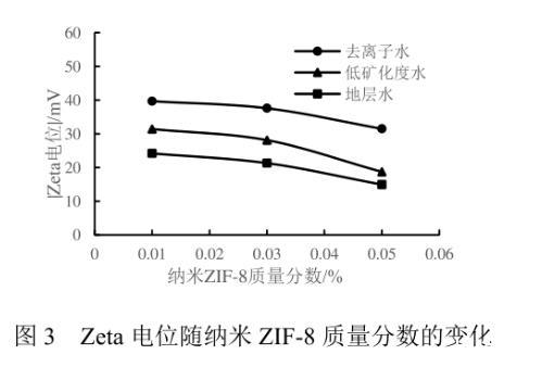 納米ZIF-8流體的穩(wěn)定性是評價其能否作為驅油劑的重要性質之一。將裝有不同濃度納米流體的樣品瓶靜置15 d后,當ZIF-8的質量分數為0.01%、0.03%時,納米顆粒在不同礦化度的流體中均保持穩(wěn)定狀態(tài),無沉淀生成,說明適當濃度的納米ZIF-8顆粒在水中有著良好的穩(wěn)定性。當ZIF-8的質量分數為0.05%時,靜置后的納米流體產生了少量沉淀,表明過高濃度的ZIF-8會互相聚結,導致顆粒變大,進而發(fā)生聚沉。