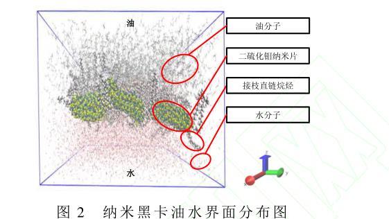 計算水分子、油相分子和納米黑卡之間的相互作用,截斷半徑分別為10?和12?。所構(gòu)建的油水界面體系由31 500個油分子和17693個水分子組成,并將納米黑卡置于所構(gòu)建的油水界面體系中。如圖2所示,油水界面上層部分的碳氫鏈表示油分子,油水界面下層區(qū)域代表水分子。