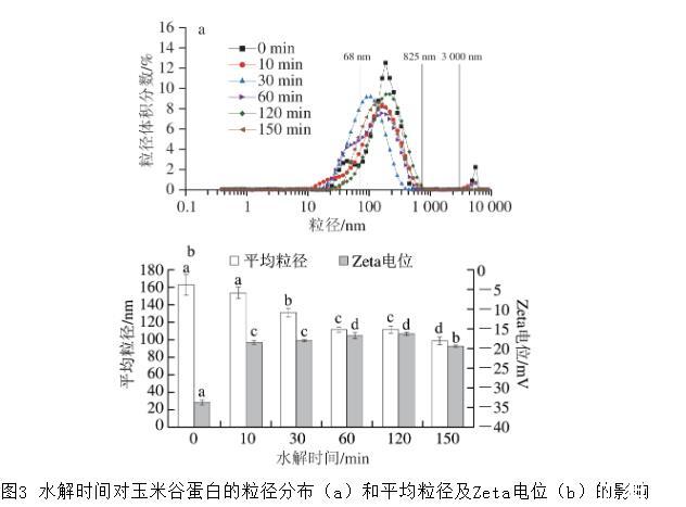 圖3水解時間對玉米谷蛋白的粒徑分布(a)和平均粒徑及Zeta電位(b)的影響