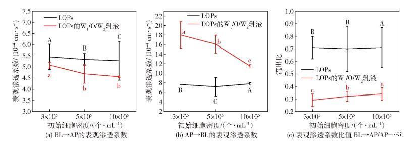 圖(a)和圖(b)中,不同大寫、小寫字母分別表示LOPs、LOPs雙重乳液的組間表觀滲透系數存在顯著差異(P<0.05),圖(c)中,不同大寫、小寫字母分別表示LOPs、LOPs雙重乳液的組間流出比存在顯著差異(P<0.05)。