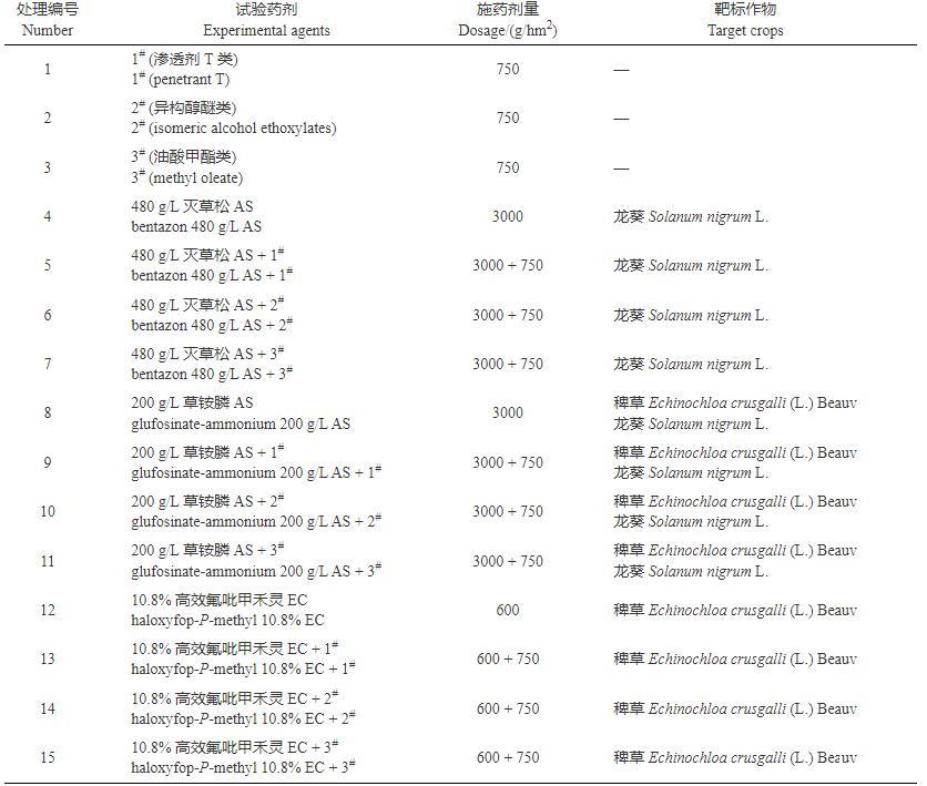 植物葉片性質(zhì)的不同會影響藥液的潤濕和持留能力。接觸角測定結(jié)果(表3)顯示:無論靶標(biāo)作物是禾本科的稗草還是闊葉科的龍葵,2#增效劑的接觸角均最小,且3種除草劑中添加2#增效劑后接觸角減小的程度最大(6,10,14),添加3#增效劑后接觸角減小的程度最小,因此,2#增效劑減小接觸角的性能最好。