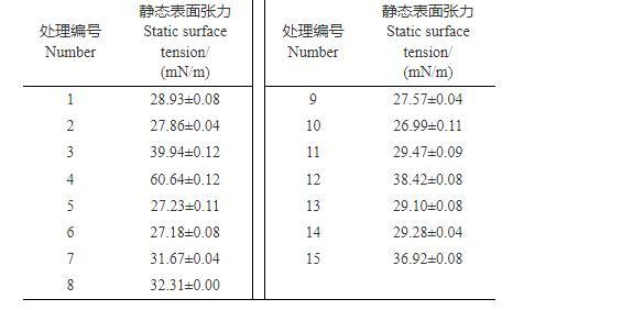 1.2.1靜態(tài)表面張力測定參照文獻方法測定。在(25±1)℃下,用0.3 mm的鉑金環(huán)(外徑20.30 mm,周長61.89 mm,密度0.998 g/mL)在全自動張力儀上先用純水進行校準(zhǔn),然后測定表1中15種處理的靜態(tài)表面張力,每個試驗至少重復(fù)3次,結(jié)果取平均值,用Origin Pro軟件(9.0版,OriginLab公司)處理數(shù)據(jù)。
