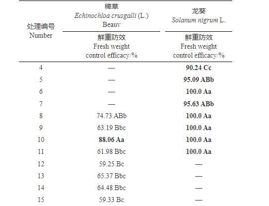 由表5數(shù)據(jù)可以看出,處理4~7對龍葵鮮重防效均在90%以上,其中最好的是添加了2#增效劑的處理6,鮮重防效為100%,其次是添加了1#增效劑的處理5和添加了3#增效劑的處理7,最差的是未添加增效劑的處理4,處理5~6與處理4差異顯著,處理6與處理5、7在0.05水平上差異顯著。處理8~11對龍葵效果均較佳,鮮重防效均為100%;對稗草防治效果最好的是添加了2#增效劑的處理10,鮮重防效為88.06%,其他處理防效略差,鮮重防效在61%~74%之間,處理10與處理8、9、11在0.05水平上差異顯著。處理12~15對稗草的防治效果均一般,鮮重防效在59%~65%之間。