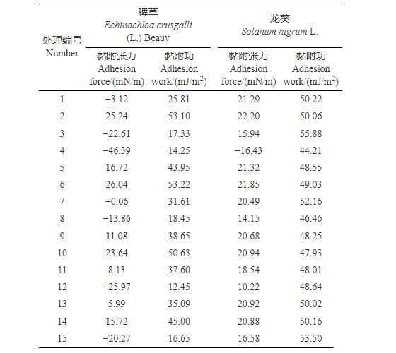 表4 15種處理作用于靶標(biāo)作物時的黏附張力和黏附功