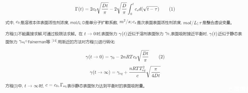 表面活性劑是一種能夠在界面吸附,降低界面張力的物質。在界面快速形成過程中,如紡織品、紙和其他基質的快速潤濕,液體的發泡,用靜態(平衡)表面張力不能全面表征表面活性劑快速降低界面張力的能力,而動態表面張力能更好地表征表面活性劑在上述過程中所起的作用。1946年Word和Tordai研究陰離子表面活性劑的界面吸附行為,提出了描述氣/液界面吸附量隨吸附時間變化的Word-Tordai方程;隨著各種檢測手段的開發應用,20世紀90年代起,關于表面活性劑的動態表面張力及其在氣/液界面吸附行為又引起該領域研究者的關注。Eastoe和Dalton通過研究雙子型非離子表面活性劑在空氣——水界面的吸附機理,驗證了Word和Tordai提出的擴散控制吸附和混合動力控制吸附模型適用于該體系。柴金玲等利用Word-Tordai方程得到烷基聚葡糖苷(APG)在不同濃度、溫度時的擴散系數和表觀擴散系數,并發現鹽對吸附行為有明顯影響;劉杰等通過Rosen模型研究膠束對APG的動態表面張力的影響,發現各項參數的變化趨勢不會因為膠束的形成而受到影響。