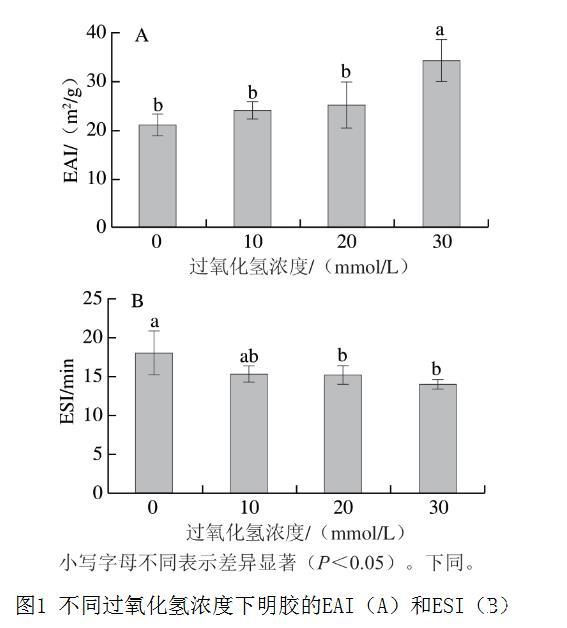 圖1 不同過(guò)氧化氫濃度下明膠的EAI(A)和ESI(B)