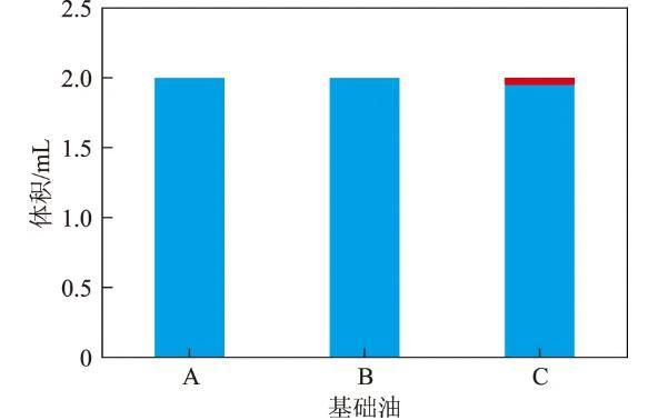 由圖1可以看出:未加復合劑時不同基礎油的分水效果不同,基礎油A和基礎油B的分水效果較好,水在離心作用下全部分出;基礎油C的極性物質含量高,親水性強,分水能力差,因此出現(xiàn)了乳化層。