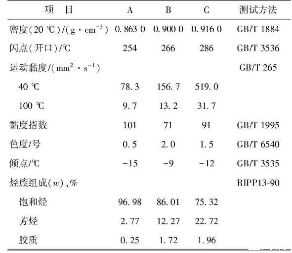 基礎油:HVIⅡ-10,HVI750,HVI150BS,分別用A,B,C表示,其基本性質見表1。添加劑為烷基水楊酸鹽復合劑(簡稱復合劑),其理化性質見表2。以上基礎油和添加劑均由中國石化潤滑油(上海)研究院提供。
