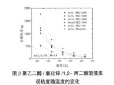 表1聚乙二醇/氯化鋅/1,2-丙二醇溶液密度和表觀粘度隨溫度變化