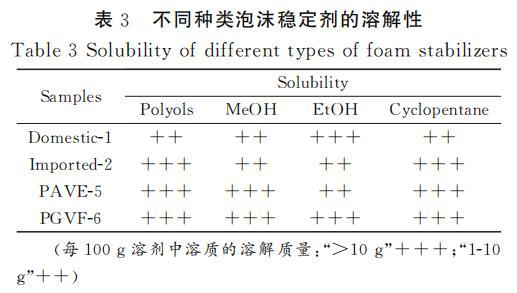 聚氨酯發(fā)泡過程中,各原料之間的相容性對泡沫的性能有重要影響。相容性好的原料可以確保發(fā)泡過程中的化學反應順利且充分進行,從而獲得均勻、細膩的泡沫結構,提高泡沫的物理性能和使用性能。表3是不同種類泡沫穩(wěn)定劑在不同溶劑中的溶解性測試,通過測試結果可知,經過接枝改性后的PAVE-5和PGVF-6在多元醇和環(huán)戊烷中的溶解性較好,和國產-1、進口-2等泡沫穩(wěn)定劑都能夠很好的溶解在多元醇和環(huán)戊烷中。PGVF-6和PAVE-5在多元醇中表現(xiàn)出的優(yōu)良溶解性主要得益于POSS接枝的APEG鏈段的醚鍵和羥基都具有明顯的極性,這使得其分子間以及與其他極性分子間可以形成較強的極性相互作用。這種相互作用有助于分子間的相容性,對聚氨酯泡沫的形成和性能有積極作用。