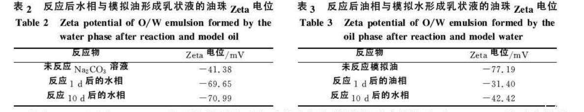 由表2可以看出,Na2CO3溶液與模擬油反應后的水相與模擬油形成乳狀液,與Na2CO3溶液和模擬油直接乳化形成的乳狀液相比,油珠Zeta電位絕對值明顯增大;反應10d的與1d的相比,變化很小。這是由于Na2CO3溶液與模擬油反應后生成一些界面活性物質溶于水相中,電離后帶負電荷,與模擬油乳化時,帶負電荷的界面活性物質吸附在油珠表面上,使油珠表面帶更多負電荷,從而使油珠Zeta電位絕對值增大。隨著反應時間的延長,生成的界面活性物質逐漸增多,油珠Zeta電位絕對值也繼續增大,但增大的幅度很小。
