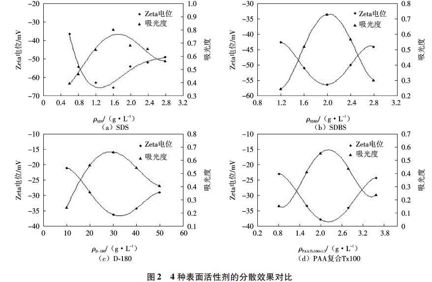 表面活性劑超聲分散法制備CNFs懸浮液的過程如下:量取55mL蒸餾水,分別溶解不同濃度的SDS、PAA復(fù)合Tx100(質(zhì)量比為1:3)、D-180和SDBS,取出5mL表面活性劑溶液,稀釋至20mL,用作紫外/可見分光光度計(jì)測試時的參比溶液.分別稱取0.01gCNFs溶于剩余50mL分散劑溶液中,機(jī)械攪拌10min,超聲分散15min,得到CNFs懸浮液.
